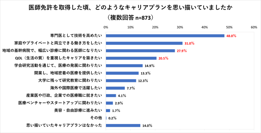 免許取得当初に思い描いたキャリアプランとして最も多かったのは「専門医として技術を高めたい」(48.0%)で、続いて「家庭やプライベートと両立できる働き方をしたい」(31.0%)、「地域の基幹病院で、幅広い診療に関わる医師になりたい」(27.9%)でした。また「QOL(生活の質)を重視したキャリアを築きたい」(20.5%)も一定の割合を占め、専門性の追求と生活との両立を志向する意識が確認されました。